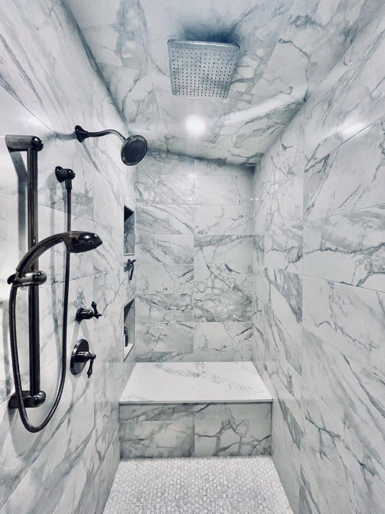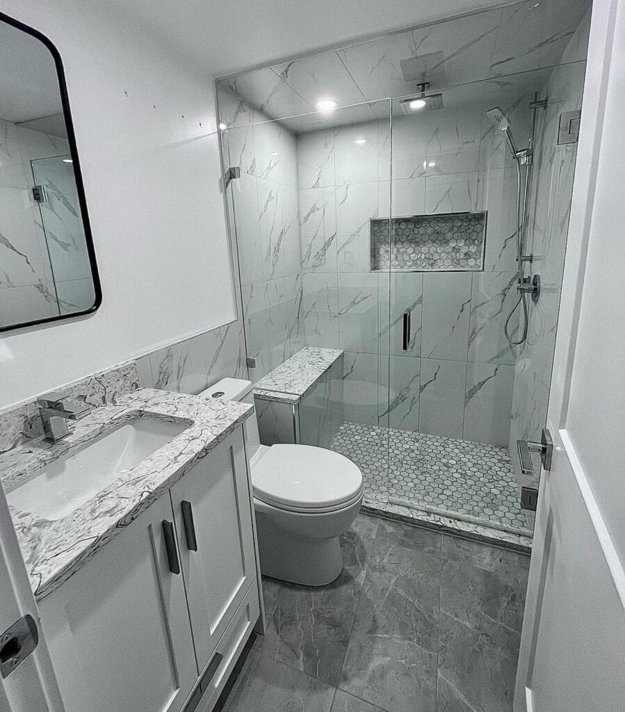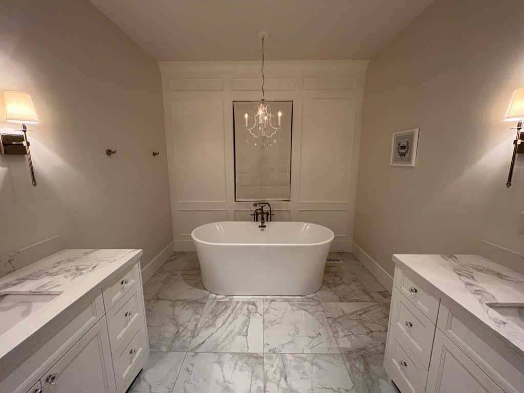 - Dual or floating vanities with high-end countertops like marble or quartz